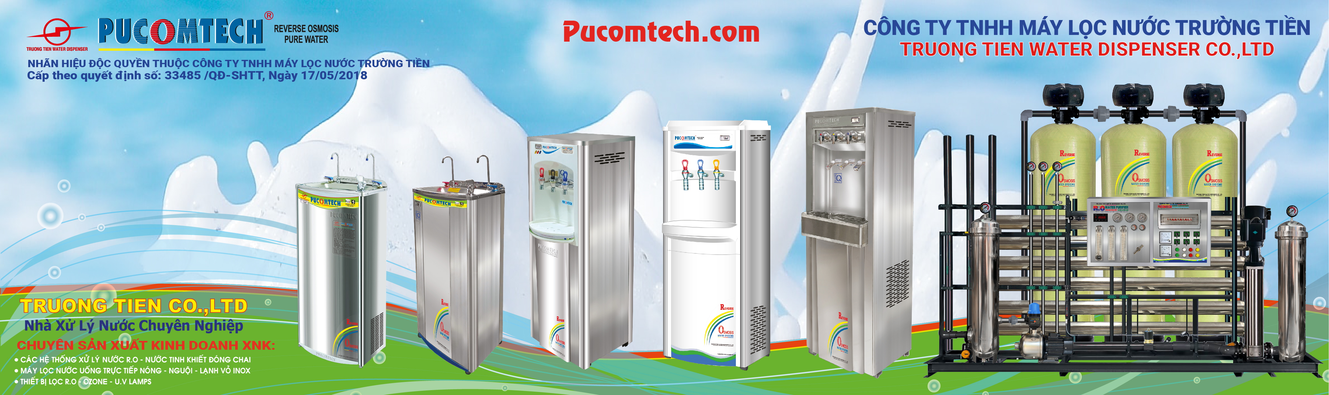 Công ty TNHH máy lọc nước Trường Tiền là một trong những nhà thiết kế, sản xuất, lắp ráp và phân phối các loại máy lọc nước mang thương hiệu Pucomtech, nhãn hiệu độc quyền thuộc công ty TNHH máy lọc nước Trường Tiền cấp theo quyết định số: 33485 /QD-SHTT, Ngày 17/5/2018.